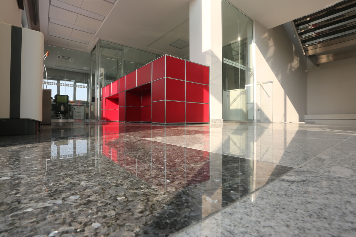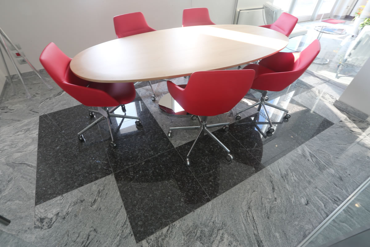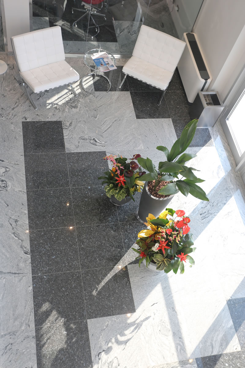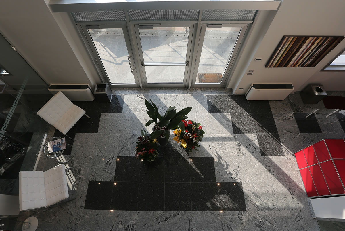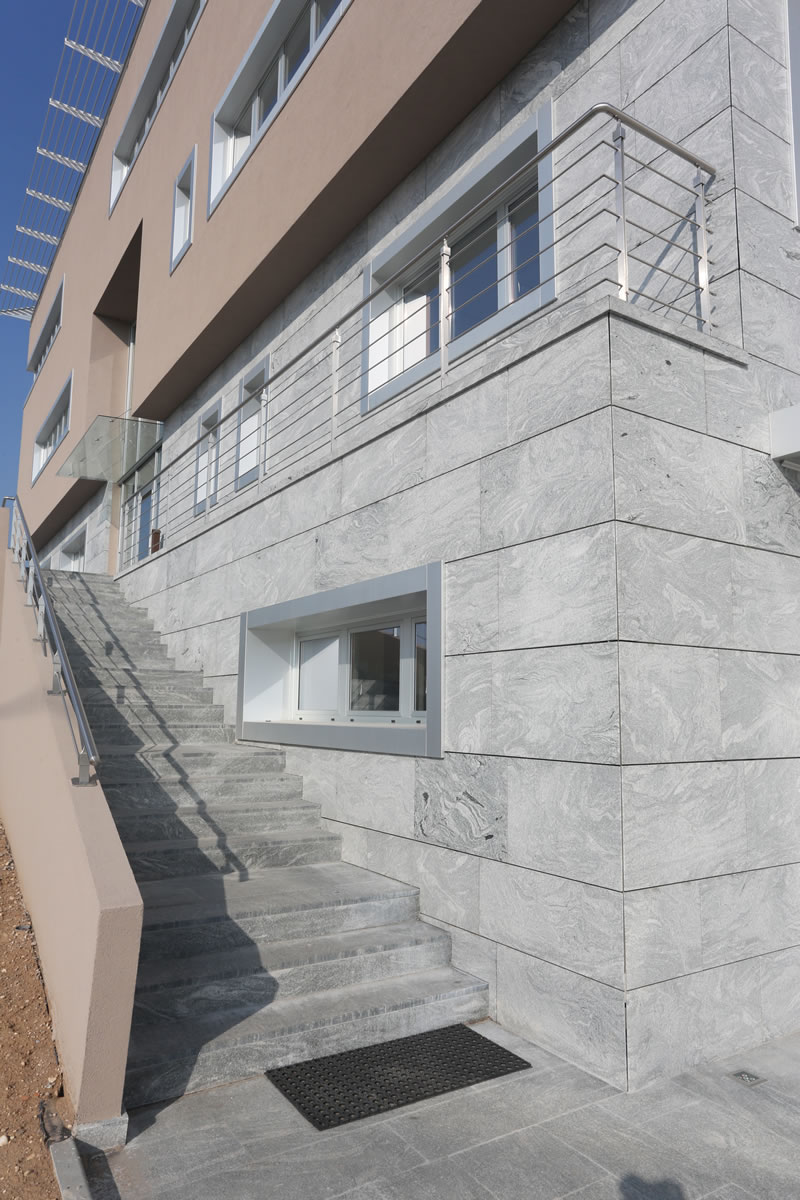 In einem neu errichteten 1.000 m2 großen Bürogebäude intervenierte Tecnomar für das technische Design und die Installation wertvoller Innen- und Außenverkleidungen. In Zusammenarbeit mit dem Designer Arch. Amadio Francesco wurden die Materialien und Designs im Detail definiert. Der Boden innerhalb der Büros wurde mit einer erhöhten Tragstruktur verlegt, um die Elektroinstallationen verwalten und die Anordnung der Bereiche je nach Bedarf variieren zu können. Die Außenverkleidung aus Granit Verde Marina wurde an einer Tragkonstruktion aus Aluminium befestigt. Das Projekt sah eine Außendämmung zwischen Mauerwerk und Steinwollverkleidung mit einer Dicke von cm vor. 10. Mauerwerkhakensysteme mit 12-mm-Stahlstiften wurden dann verwendet, um das Gewicht der Struktur und der Verkleidung tragen zu können. Im Inneren wurden Platten aus Viscont White und Blue Pearl so positioniert, dass sie geometrische Figuren bilden. Der Bodenbelag mit einer Größe von 60x60 wurde zunächst auf eine Calciumsulfatplatte geklebt. 18mm. und Stahlschale. Die Platten wurden so geschnitten und kombiniert, dass die natürliche Maserung des Steins respektiert wird. Die Wandverkleidungen in den Bädern wurden in Kontinuität mit dem Bodenbelag erstellt. Für die Umkleide- und Betriebskantinenbereiche hingegen wurde serizzo Granitboden mit gebürsteter Oberfläche verwendet, verklebt auf einem Zementestrich. Für das Äußere wurde eine geflammte Verde Marina-Granitabdeckung mit einigen gebürsteten Platten verwendet, die ein Farbspiel erzeugen. Das Material ist ästhetisch wertvoll und sehr widerstandsfähig, was keiner Reinigung bedarf. Die Platten wurden mit einem Kerbsystem an der Aluminium-Tragkonstruktion eingehakt. Die verschiedenen Abmessungen in Höhe und Breite der Verkleidung ermöglichen Flexibilität im Installationssystem. Tecnomar kümmerte sich um alle Verarbeitungsphasen der verschiedenen Materialien und die Installation, um dem Kunden das fertige Projekt zu übergeben.