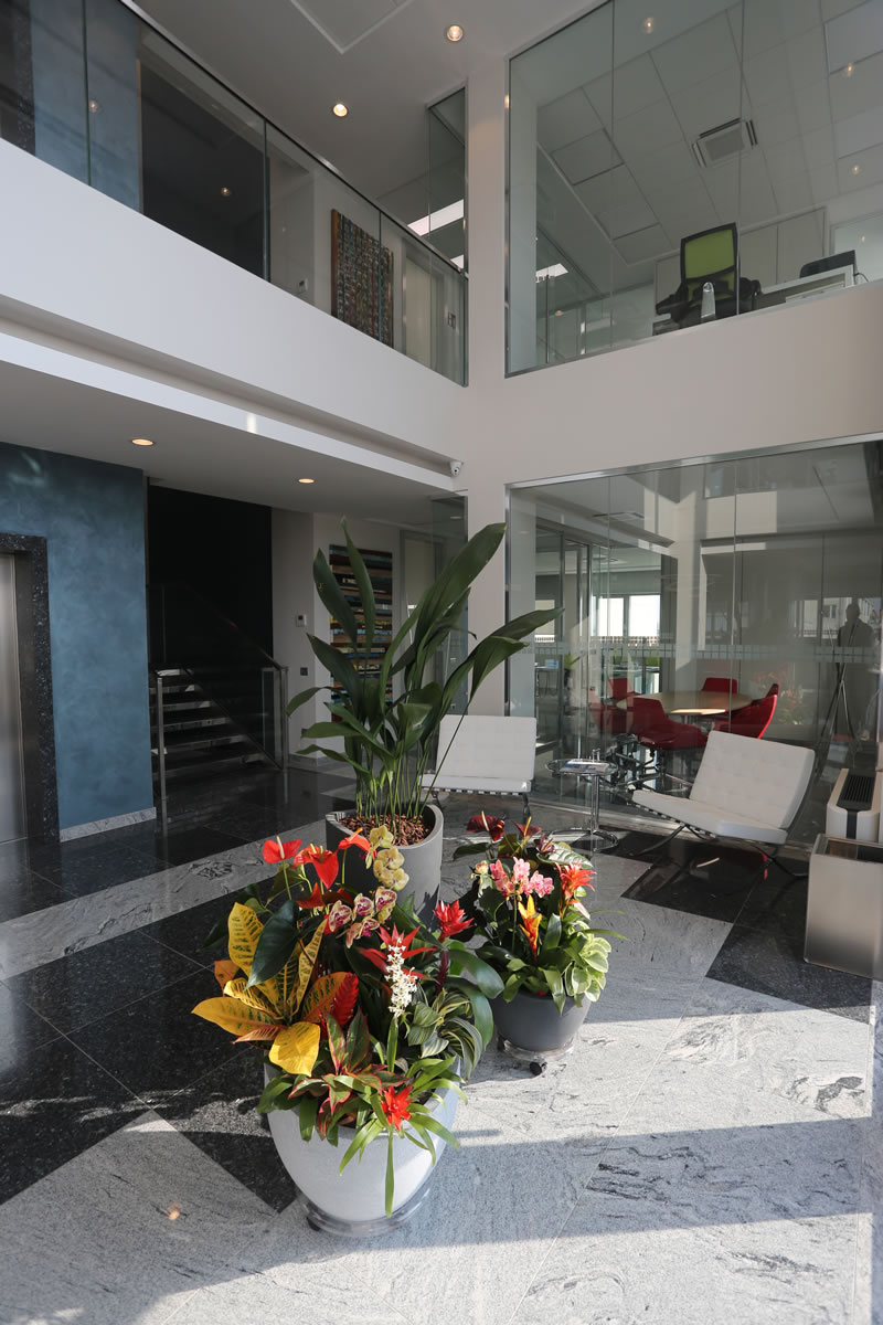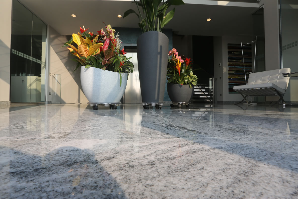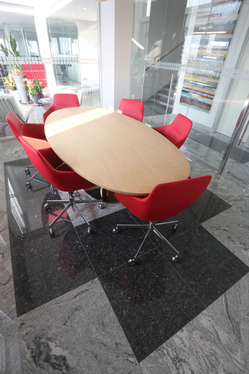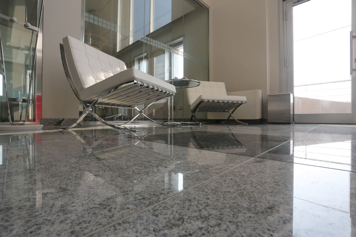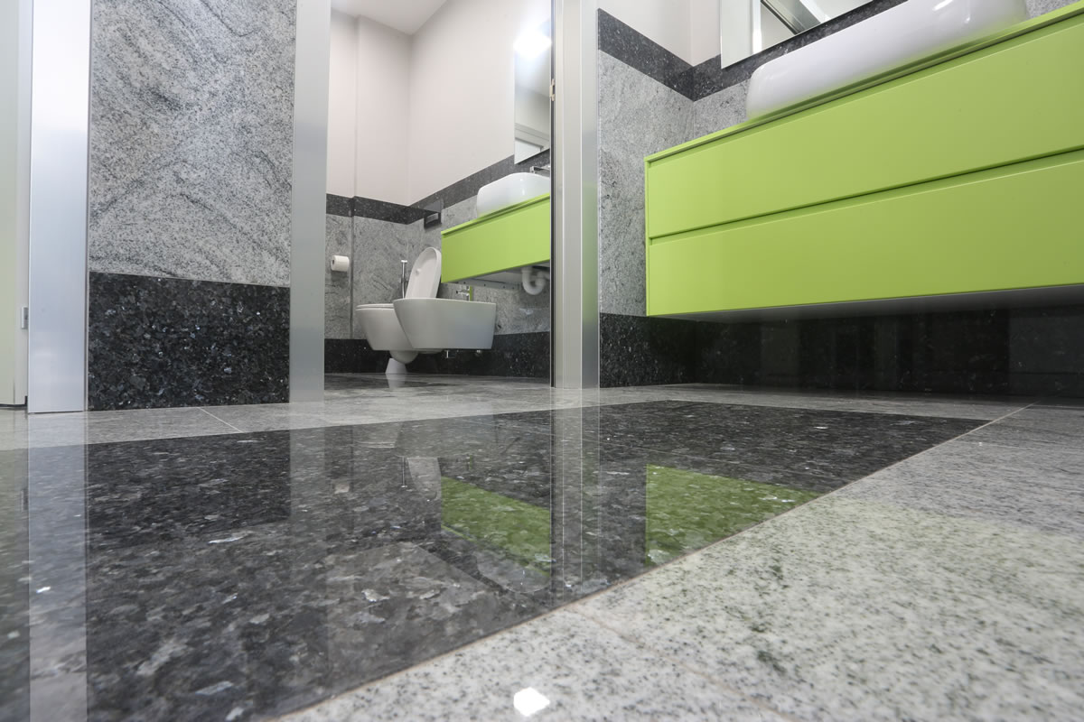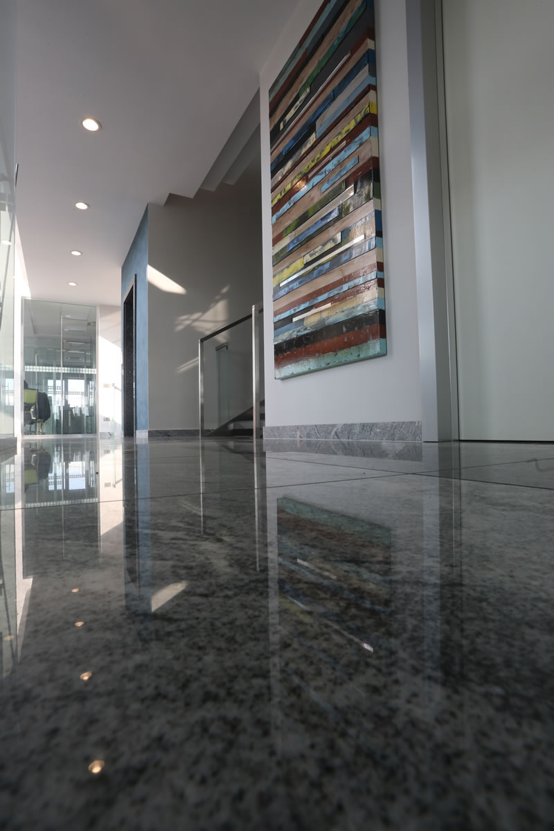 In einem neu errichteten 1.000 m2 großen Bürogebäude intervenierte Tecnomar für das technische Design und die Installation wertvoller Innen- und Außenverkleidungen. In Zusammenarbeit mit dem Designer Arch. Amadio Francesco wurden die Materialien und Designs im Detail definiert. Der Boden innerhalb der Büros wurde mit einer erhöhten Tragstruktur verlegt, um die Elektroinstallationen verwalten und die Anordnung der Bereiche je nach Bedarf variieren zu können. Die Außenverkleidung aus Granit Verde Marina wurde an einer Tragkonstruktion aus Aluminium befestigt. Das Projekt sah eine Außendämmung zwischen Mauerwerk und Steinwollverkleidung mit einer Dicke von cm vor. 10. Mauerwerkhakensysteme mit 12-mm-Stahlstiften wurden dann verwendet, um das Gewicht der Struktur und der Verkleidung tragen zu können. Im Inneren wurden Platten aus Viscont White und Blue Pearl so positioniert, dass sie geometrische Figuren bilden. Der Bodenbelag mit einer Größe von 60x60 wurde zunächst auf eine Calciumsulfatplatte geklebt. 18mm. und Stahlschale. Die Platten wurden so geschnitten und kombiniert, dass die natürliche Maserung des Steins respektiert wird. Die Wandverkleidungen in den Bädern wurden in Kontinuität mit dem Bodenbelag erstellt. Für die Umkleide- und Betriebskantinenbereiche hingegen wurde serizzo Granitboden mit gebürsteter Oberfläche verwendet, verklebt auf einem Zementestrich. Für das Äußere wurde eine geflammte Verde Marina-Granitabdeckung mit einigen gebürsteten Platten verwendet, die ein Farbspiel erzeugen. Das Material ist ästhetisch wertvoll und sehr widerstandsfähig, was keiner Reinigung bedarf. Die Platten wurden mit einem Kerbsystem an der Aluminium-Tragkonstruktion eingehakt. Die verschiedenen Abmessungen in Höhe und Breite der Verkleidung ermöglichen Flexibilität im Installationssystem. Tecnomar kümmerte sich um alle Verarbeitungsphasen der verschiedenen Materialien und die Installation, um dem Kunden das fertige Projekt zu übergeben.
